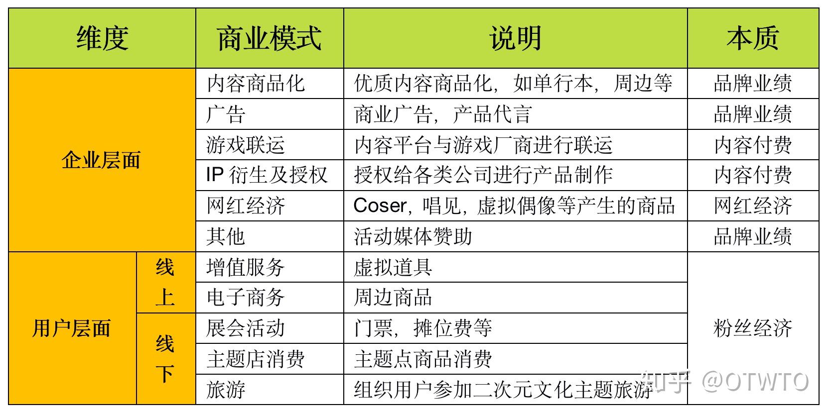 二次元的商业模式可以从企业层面和用户层面进行分类。