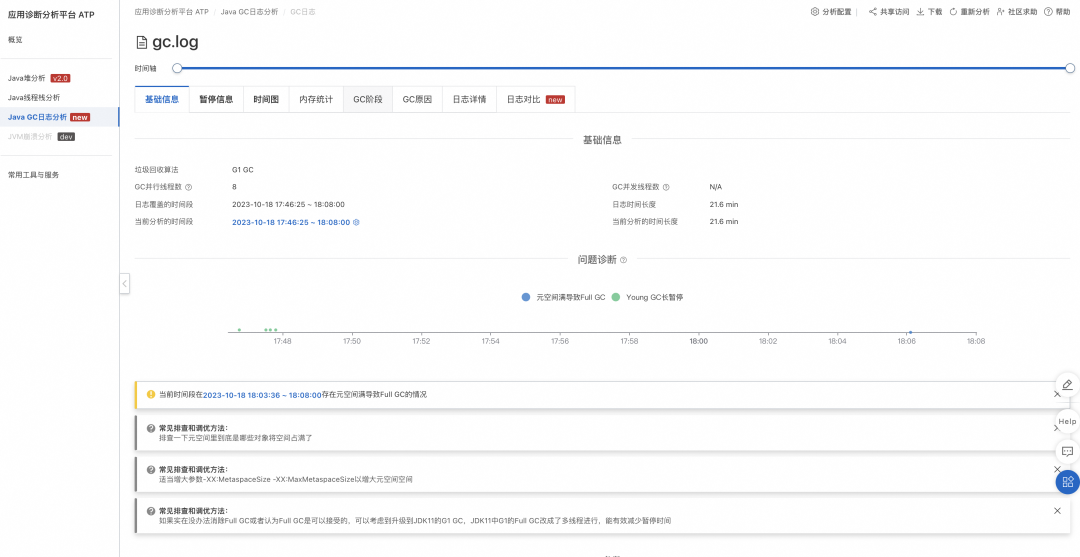ATP 的GC日志分析可以基于时间轴给出相关的建议。比如之前元空间泄漏的问题,会通过日志给出建议。