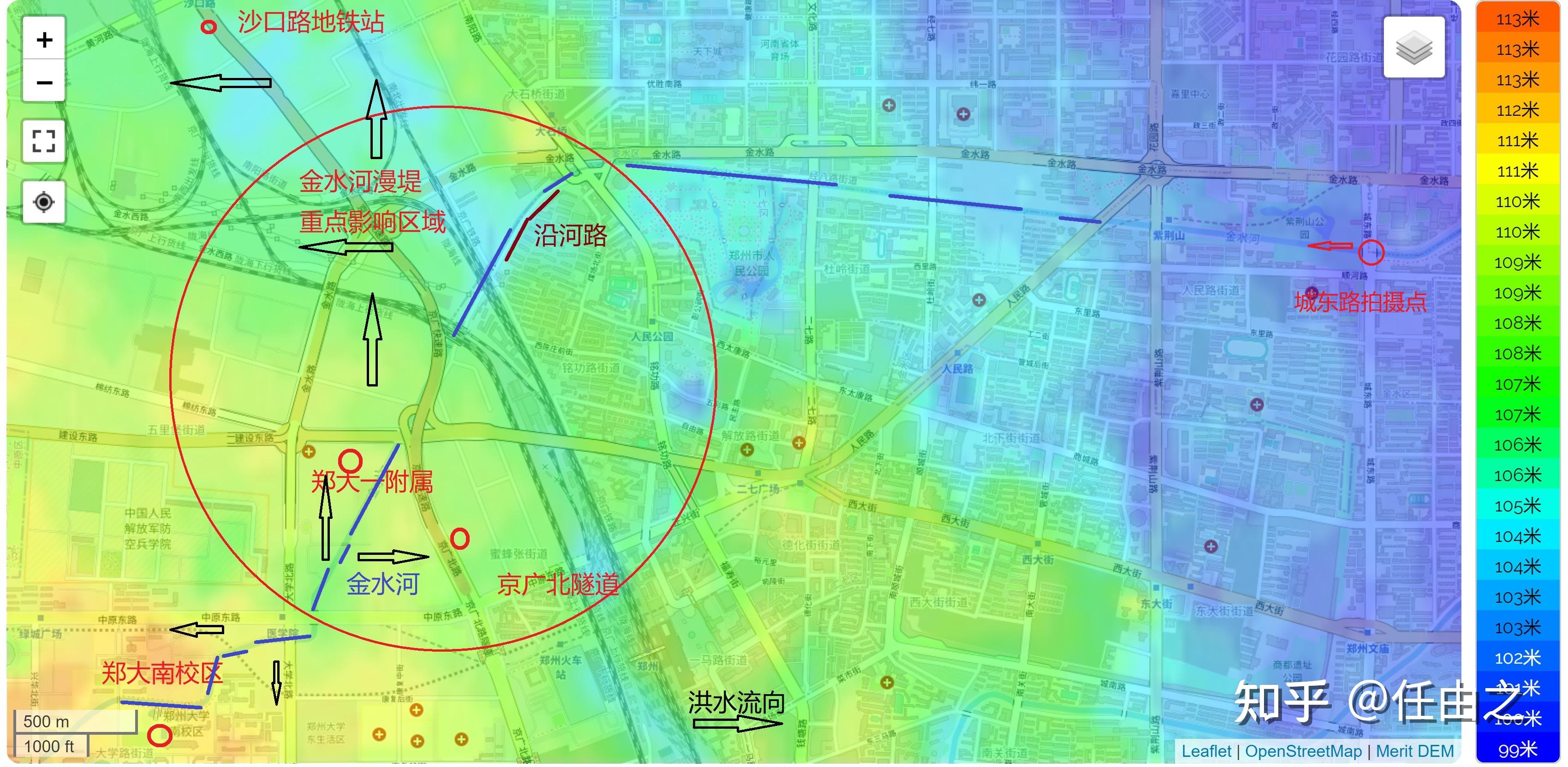 四、 上游15:00-17:00,西三环启福大道金水河桥漫至桥面(河道宽70米左右)16:30-17:00河中倒伏的芦苇及水波形态已可呈现一定流速 ,该桥距南水北调河倒虹吸闸仅0.85公里,金水河上游水流从地表流过南水北调河地下虹吸管道,此处并未出现漫堤现象,否则南水北调工程不保; 18:00-18:30分以后有人工湖域缓冲的帝湖花园小区地面停车场被淹,18:28分 地势相对较高的郑大南校区北金水河桥虽未严重漫堤,但河水湍急已经形成快速水流,经过第一个折弯后漫出河堤,导致 校区东门闸口洪水冲入校园,北面的中原东路也有军校救援队伍将几十名洪水所困的群众救出的报道。 这里要强调的如上所述,降水导致的河水漫堤后,洪水不再受河道流向约束,而是向四周漫延,河道于是失去超出最大降水流量的泄洪能力。