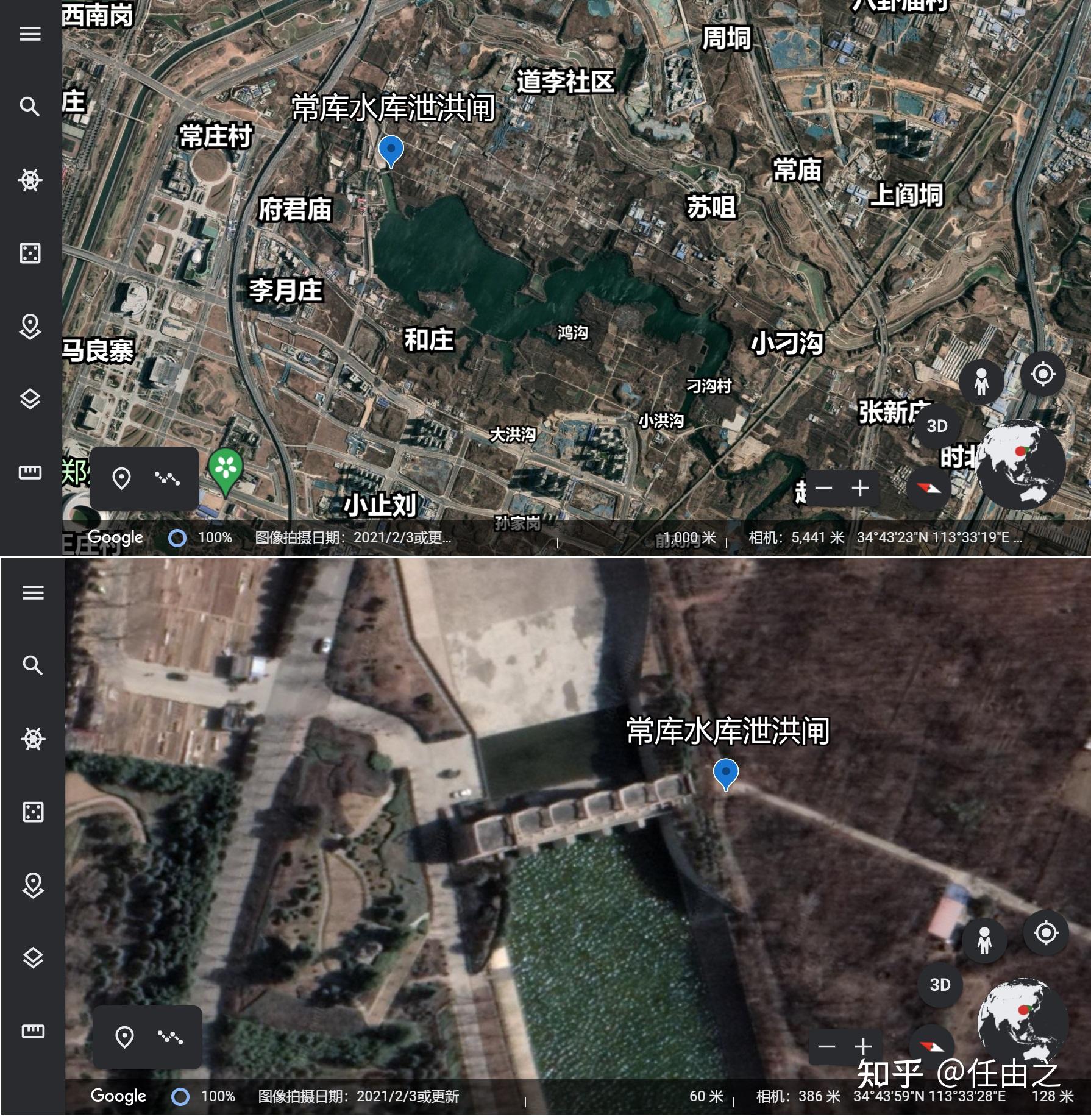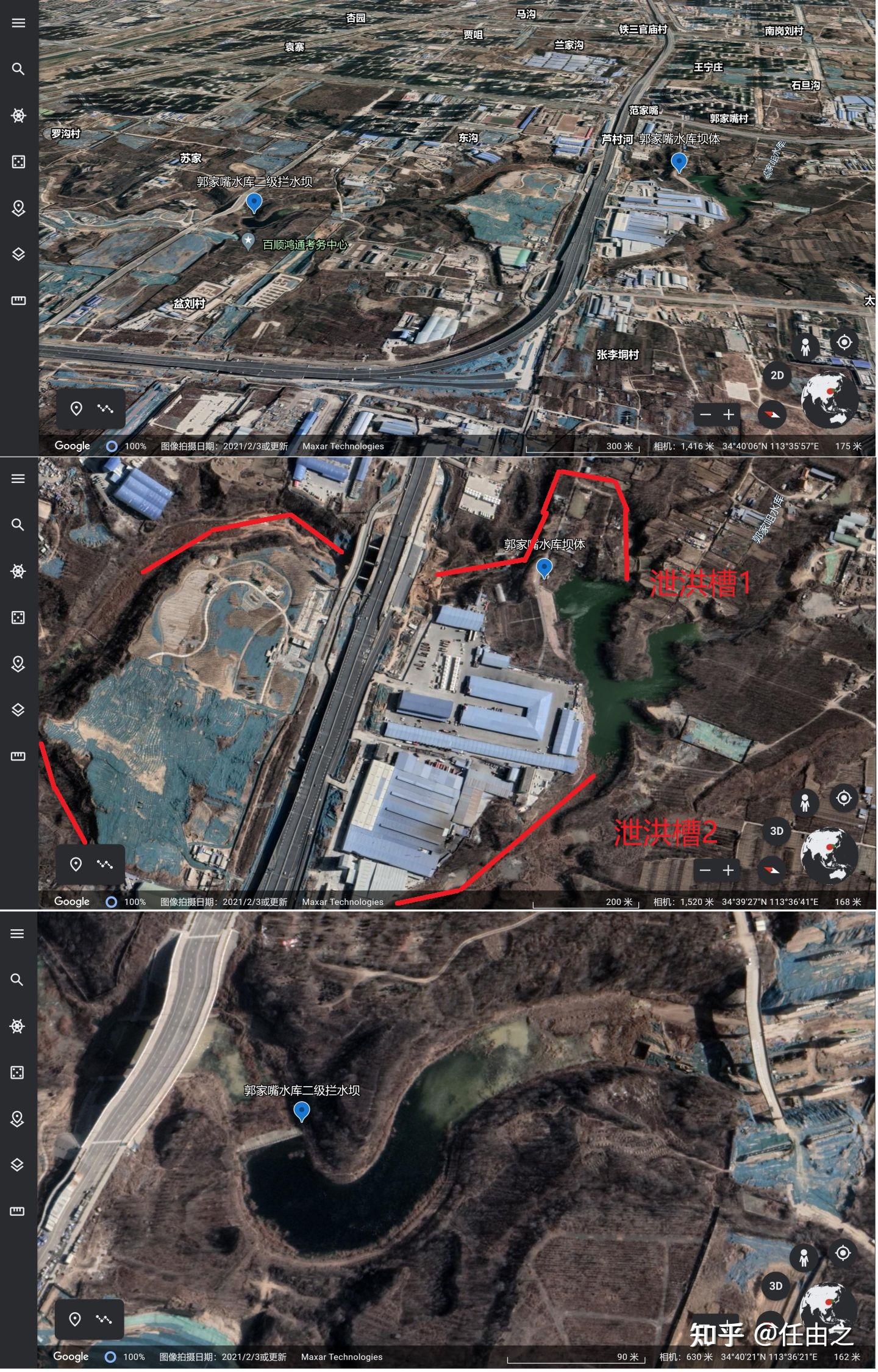 12、从卫星地图上看, 郭家嘴水库坝体为拦水坝,最初设计并没有泄洪闸口,并不具备连续的蓄洪调节能力 ;下游1.8公里有二级拦水坝,其功能的多梯度设计挡水措施以减少泥沙下泄,避免产生泥石流;这样在上游来水过大极易造成水库漫堤溃坝的风险,因此只能在 库容超过警戒水位后,在坝体侧开泄洪槽泄洪。 卫星地图上也很容易看出与常庄水库的差异。