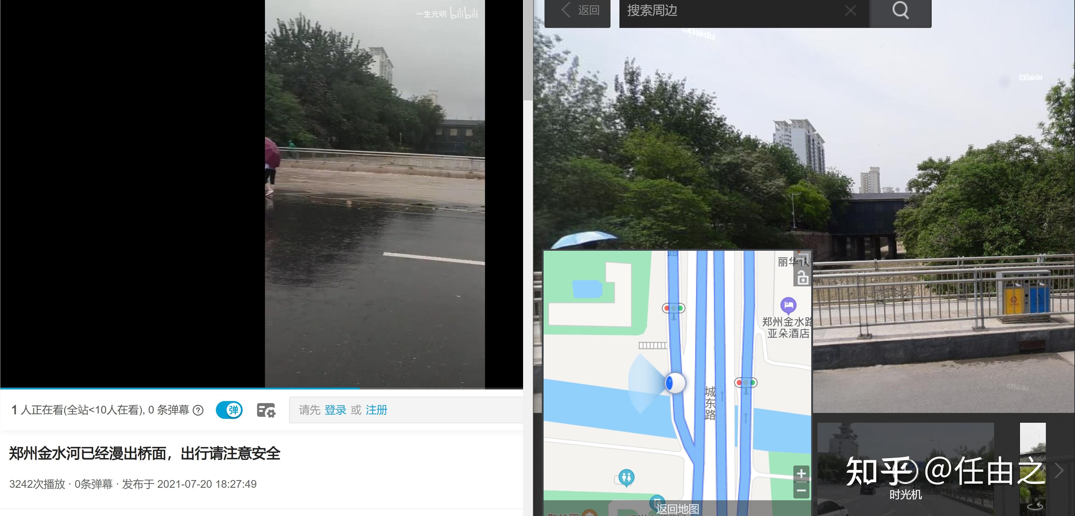 二、 金水河郑大南校区至郑大一附属和沿河路一带是郭家嘴水库泄洪的瓶颈。 此段满水河道仅20米宽,并存在两个近直角的折弯,洪水下行受河道所限流速受阻易漫堤。通过视频看 7月20日11:28分 ,郑州城区大部分还没有积水时, 沿河路的京广铁路桥金水河右岸河水已冲出河堤 ,泄洪能力达到极限;上游来水加大,河水只会向两岸漫延,从小河变成大河,直至形成大面积积水的城市“湖泊”,河道于是失去了泄洪功能,洪水向四周低洼处漫延灌注(包括河道向下游排水的极限流量),水面上涨直至入水和出水达到平衡,并 随水情变化呈齐涨共落的特点 。
